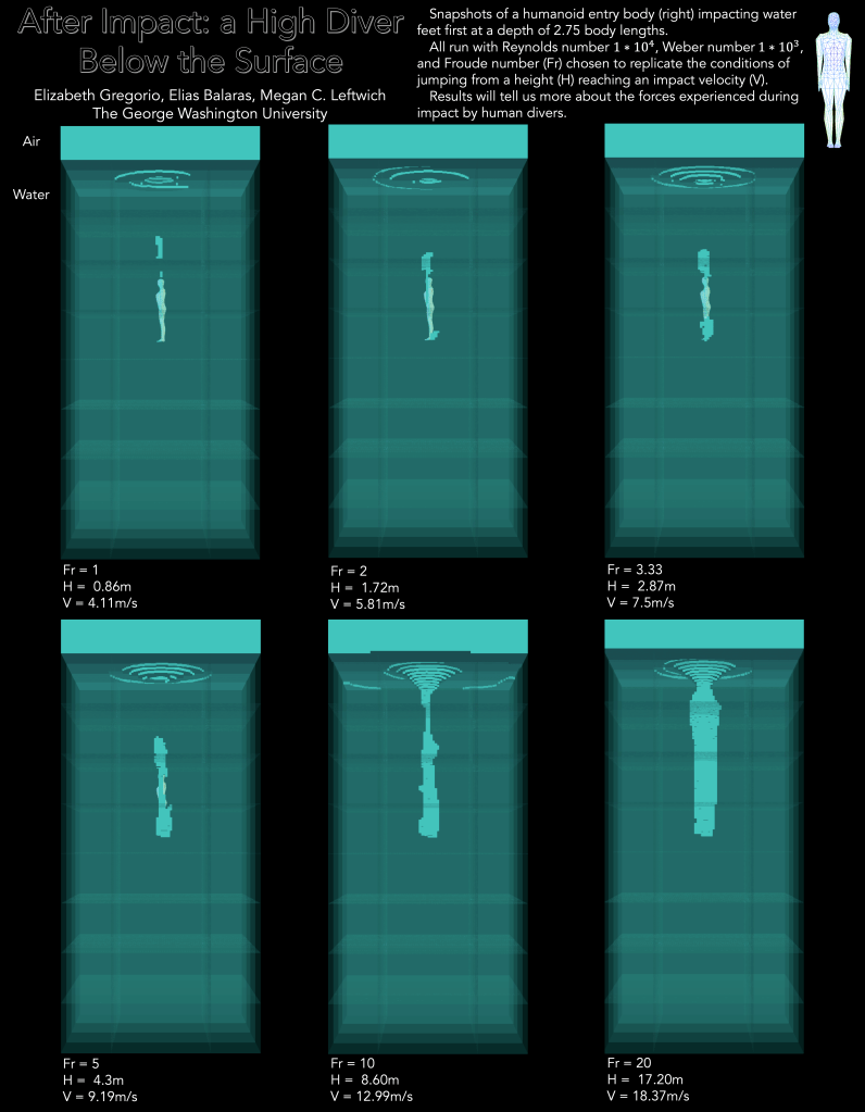 I advanced the immersed boundary method force formulation for multiphase flows in Flash4 to to study sources of injury for cliff divers. This work was presented in a Gallery of Fluid Motion poster in 2022 (see left).