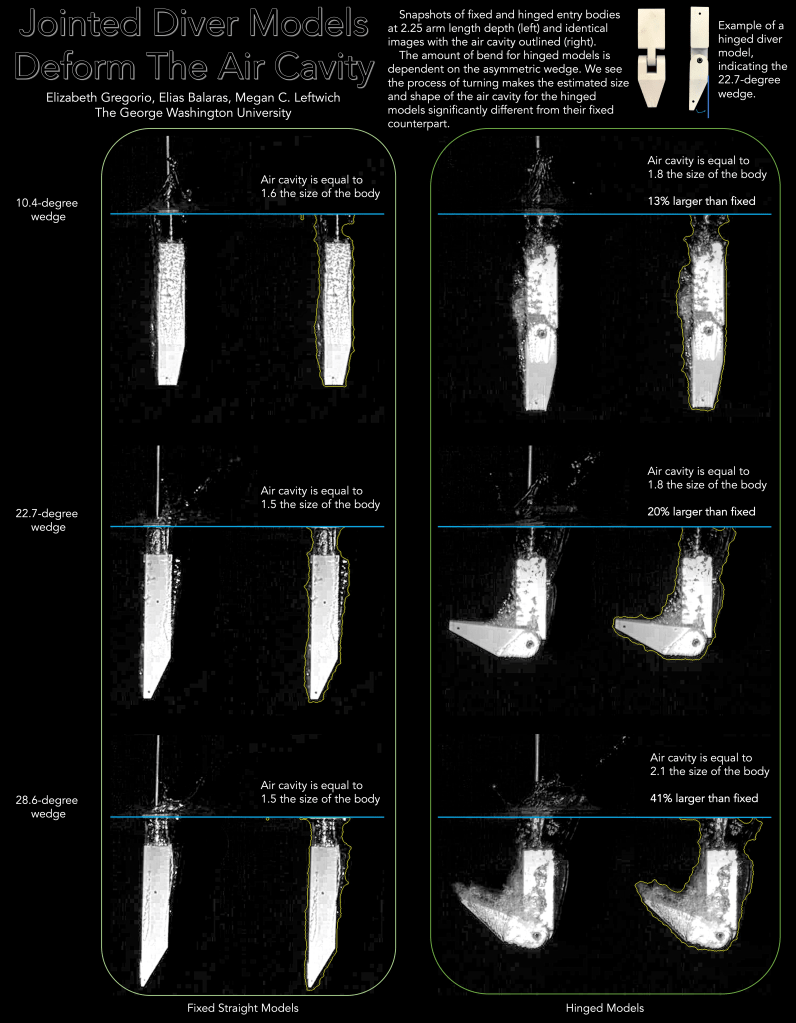 I designed single jointed diver models and a driven entry body experimental setup to understand how a body that dynamically changes shape after impact changes the formation of the air cavity and splash.
